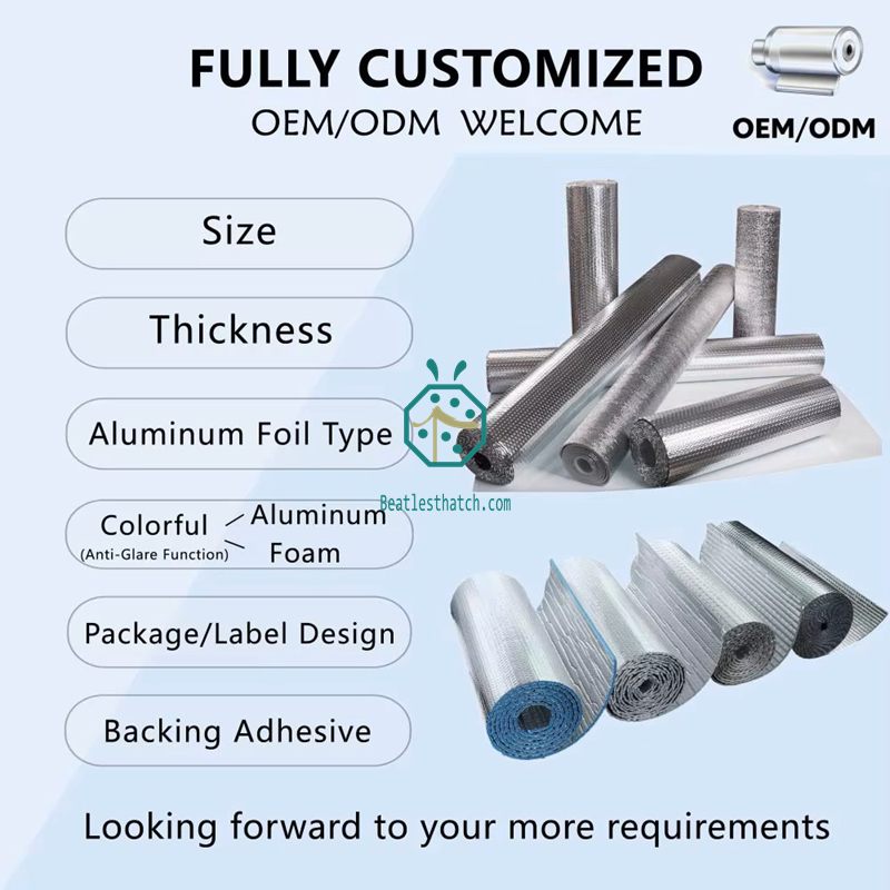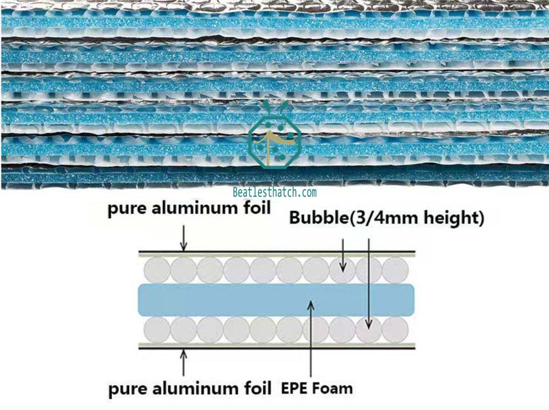 Vật liệu cách nhiệt nhôm hai lớp và xốp EPE cho mái tranh vùng nhiệt đới.