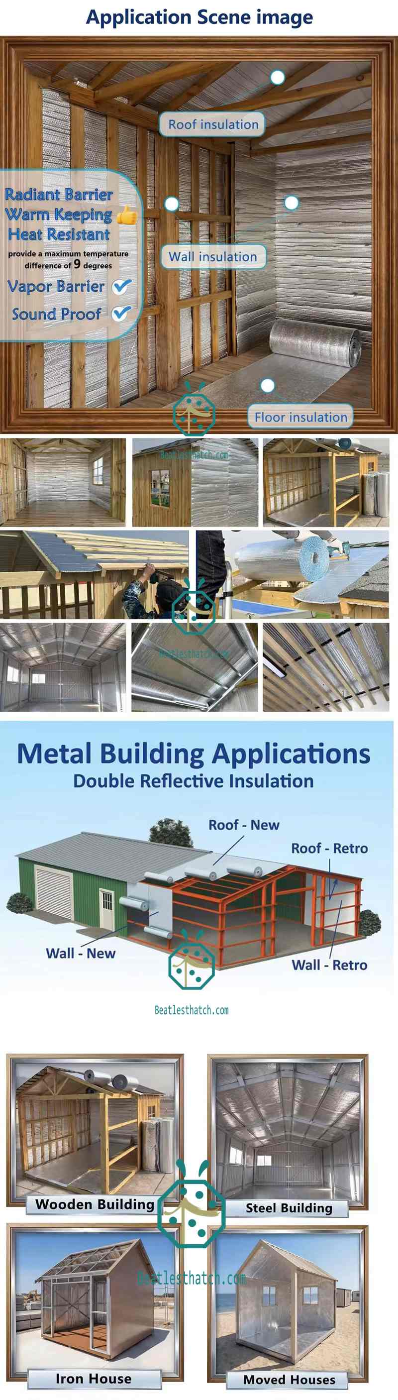 Vật liệu cách nhiệt dạng lá nhôm chống cháy hiệu suất cao 10mm. Gồm hai lớp bong bóng và lớp xốp EPE. Lý tưởng cho mái nhà nghỉ dưỡng nhiệt đới và ngói lợp bằng vật liệu tổng hợp.
